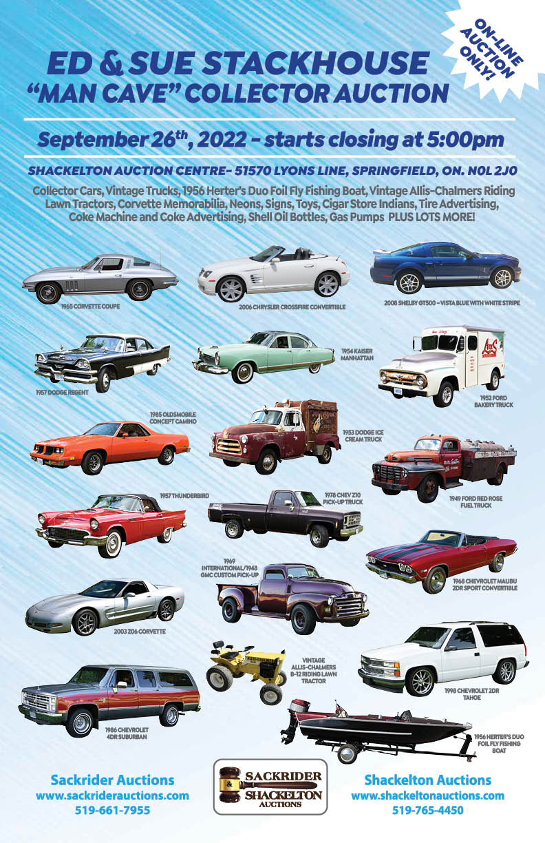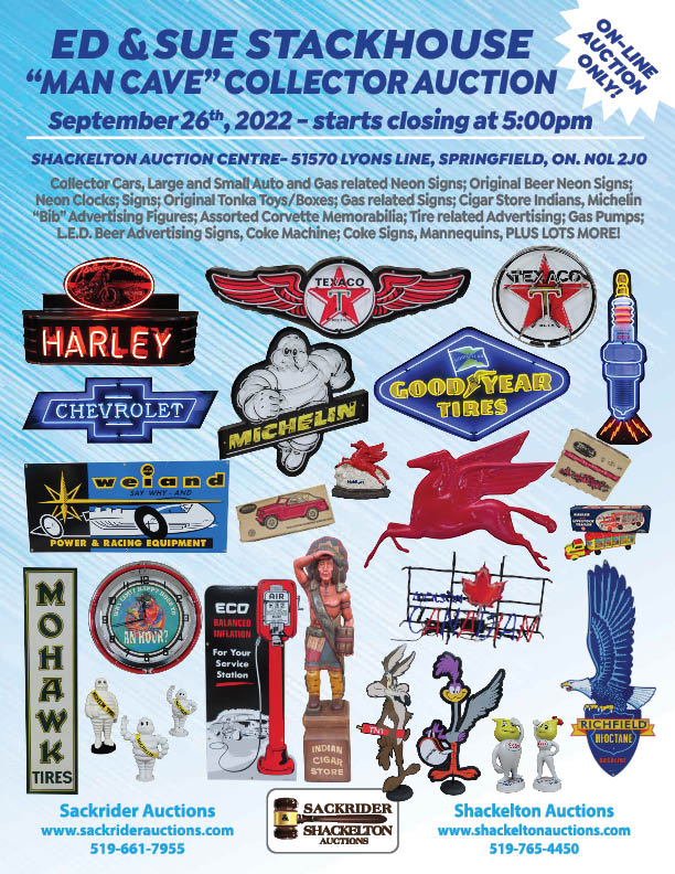 COLLECTOR CARS, Large and Small Auto and Gas related NEON SIGNS, Original BEER NEON’S, Neon Clocks, Signs, New Tonka Toys in Original Boxes, Gas related Signs, Cigar Store Indians, Assorted Michelin "Bib" Advertising Figures, Assorted Corvette Memorabilia, Assorted Tire related Advertising, Shell Oil Bottles, L.E.D. Beer Advertising Signs, Coke Machine, Coke Signs. PLUS LOTS MORE!
