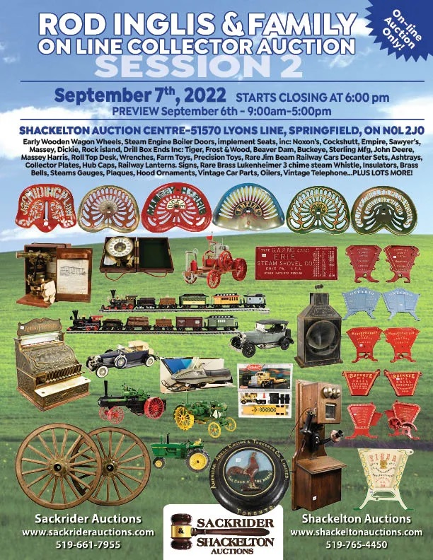 VIEWING: Tuesday, September 6th from 9am to 5pm at Shackelton Auction Centre (In the shop behind the main building) 51570 Lyons Line, Springfield, Ontario, N0L 2J0