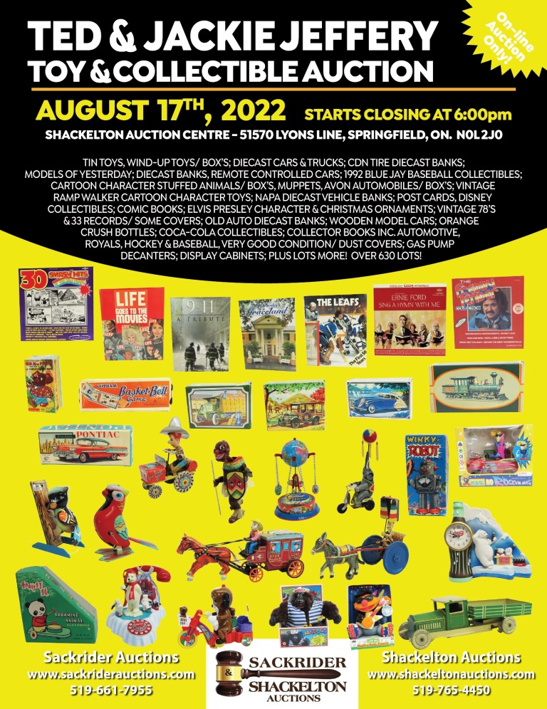 Tin Toys, Wind-up Toys/ Box’s; Diecast Cars & Trucks; Cdn Tire Diecast Banks; Models Of Yesterday; Diecast Banks, Remote Controlled Cars; 1992 Blue Jay Baseball Collectibles; Cartoon Character Stuffed Animals/ Box’s, Muppets, Avon Automobiles/ Box’s; Vintage Ramp Walker Cartoon Character Toys; Napa Diecast Vehicle Banks; Post Cards, Disney Collectibles; Comic Books; Elvis Presley Character & Christmas Ornaments; Vintage 78’s & 33 Records/some Covers; Old Auto Diecast Banks; Wooden Model Cars; Orange Crush Bottles; Coca-Cola Collectibles; Collector Books Inc. Automotive, Royals, Hockey & Baseball, Very Good Condition/ Dust Covers; Gas Pump Decanters; Display Cabinets; Plus Lots More! Over 630 Lots!